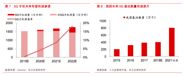 以导热石墨为例,5G手机有望在更多关键零部件部位采用定制化导热石墨方案,同时复合型和多层高导热膜由于具备更优的散热效果而有望被更多采用,从而带来导热石墨单机价值的显著提升。假设未来5G手机中的导热石墨单价是4G手机中的2.5倍,伴随5G手机渗透率的提升,应用于智能手机的导热石墨市场规模将有望实现翻倍以上增长。