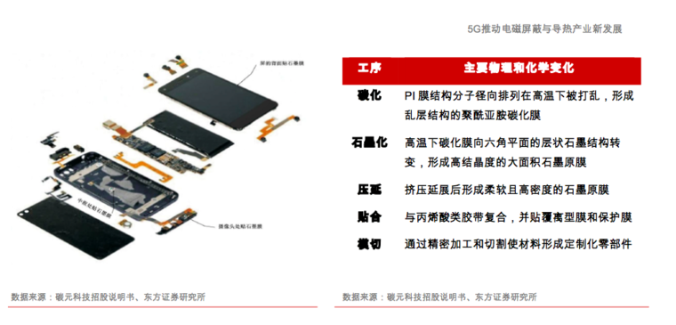 从产品形式角度来看,高导热石墨膜主要分为单层高导热膜、复合型高导热膜和多层高导热膜等多种类型。其中,单层高导热膜应用范围最广,复合型和多层高导热膜是在单层高导热膜基础上为满足客户更多的设计功能和需要与铜箔或者多片石墨膜复合而成。其中,单层高导热膜主要强调其优越的导热系数;多层高导热膜在具有高导热性能的同时还有一定的储热性能;复合型高导热膜兼具导热和储热性能,同时具有一定屏蔽辐射作用。5G时代的智能终端产品伴随更高的功耗和散热需求,同时兼具零部件创新升级大势,因此复合型和多层导热石墨膜有望迎来更广泛的应用。