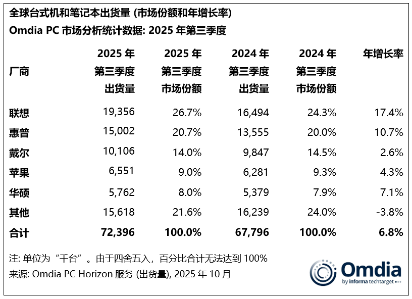 2025年第三季度全球PC市场增长6.8%:联想位居第一